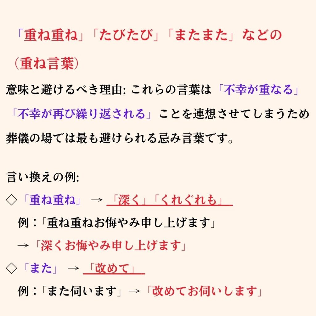葬儀の場では、「重ね重ね」や「たびたび」と